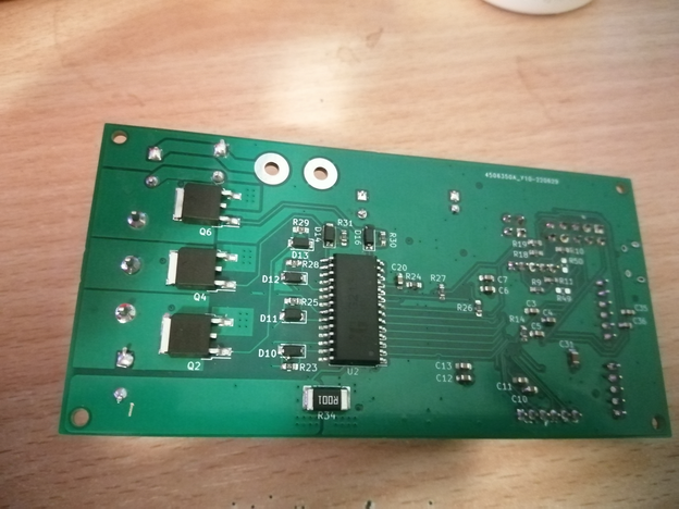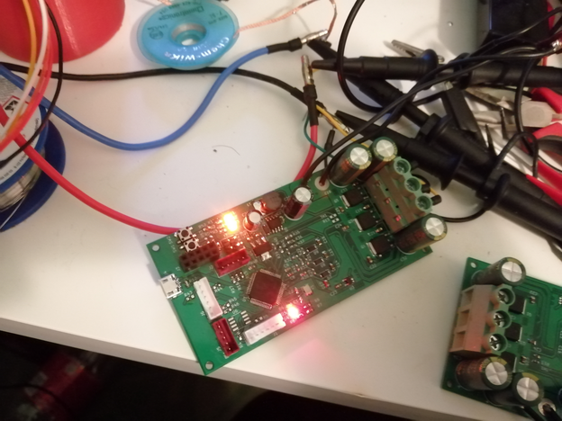 The parts only cost about 10€ per board, most expensive being the MCU at 2.5€. I used IR2136 to drive the 6 NMOS, namely EG2136 and SLM2136 (both worked interchangeably). IR2136 has somewhat bad reputation based on what I’ve seen online. I was quite careful to avoid unneccesarily fast switching transients and it has worked without issues for me. Keep in mind its an old chip, I used it only because its cheap.
